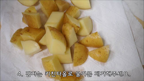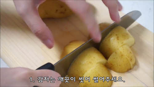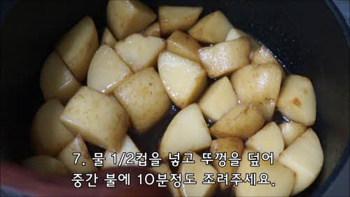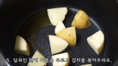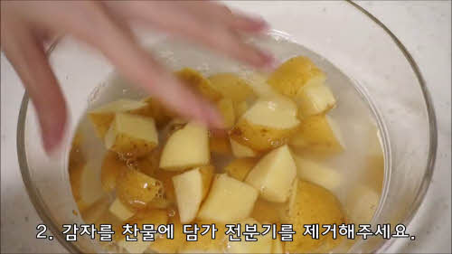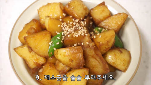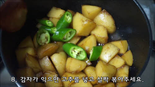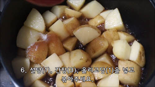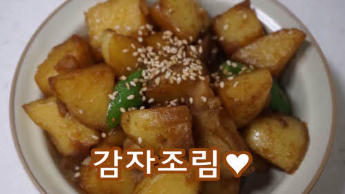 간장감자조림 만들기 감자는 깨끗이 씻어 썰어주세요. 감자를 찬물에 담가 전분기를 제거해주세요. 고추를 썰어주세요. 감자는 키친타올로 물기를 제거해주세요. 달궈진 팬에 기름을 두르고 감자를 볶아주세요. (5분정도) 설탕(1), 간장(3), 올리고당(1)을 넣고 볶아주세요. 물 1/2컵을 넣고 뚜껑을 덮어 중간 불에 10분정도 조려주세요. 감자가 익으면 고추를 넣고 살짝 볶아주세요. 깨소금을 솔솔 뿌려주세요. 완성