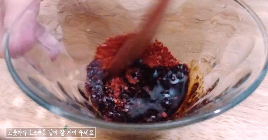 설탕 1스푼과 간장 2스푼을 담은 후에 고춧가루 1스푼을 넣어 잘 저어 주세요