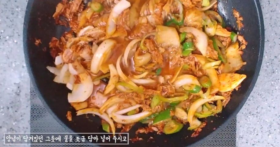 양념장을 만들고 김치와 양념장을 참기름을 두른 후 볶아 주세요