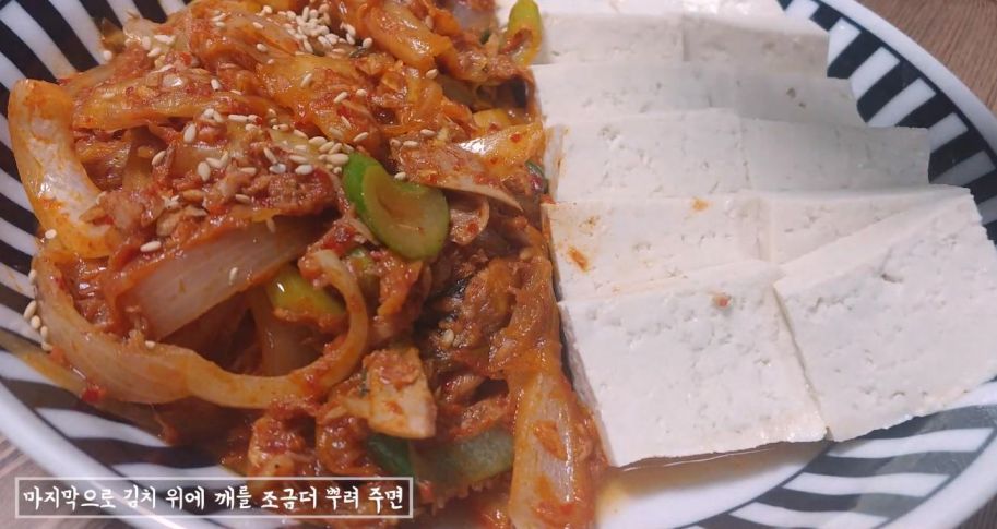 그릇에 자른 두부와 김치를 올려준후 깨를 조금 뿌려 주면