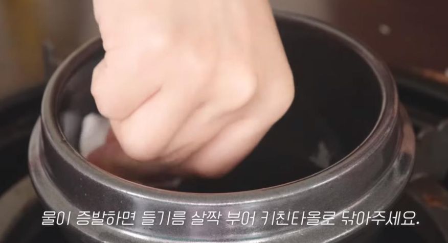 계란찜 만들기 전에 뚝배기 코팅부터 해주세요. 약불로 뚝배기를 달구고 들기름을 얇게 펴 발라줍니다.