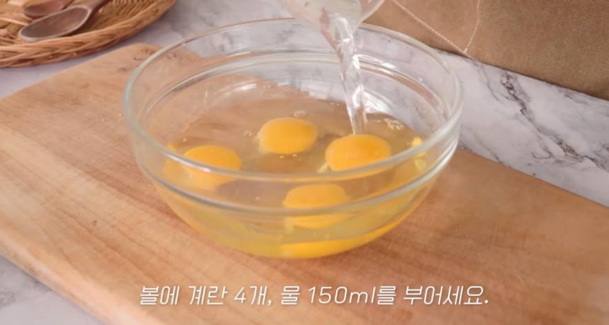 계란 4개, 물 150ml, 소금 1작은술, 맛술은 1.5큰술을 넣어주고 잘 섞어줍니다.