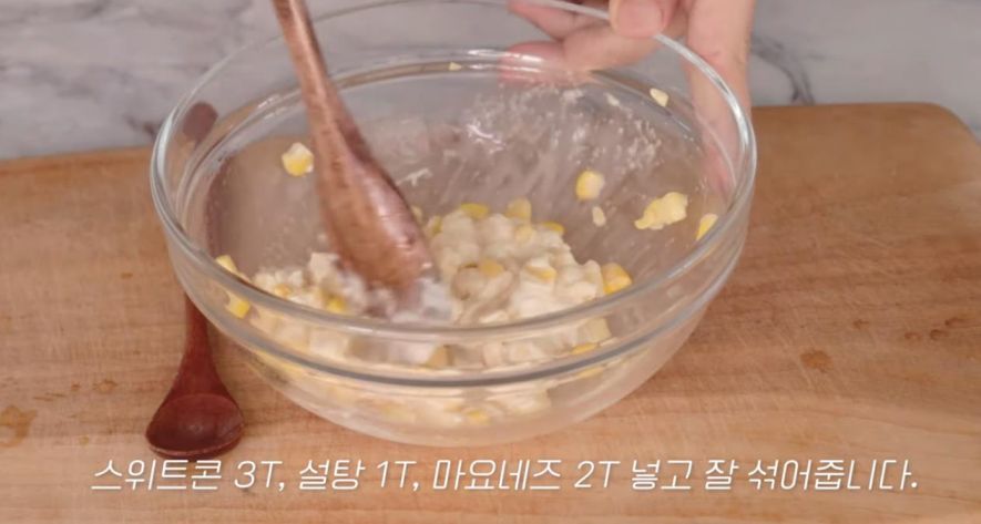스위트콘 3큰술 볼에 담아 설탕 1큰술, 마요네즈 2큰술을 넣고 섞어줍니다.