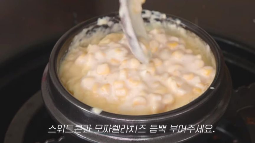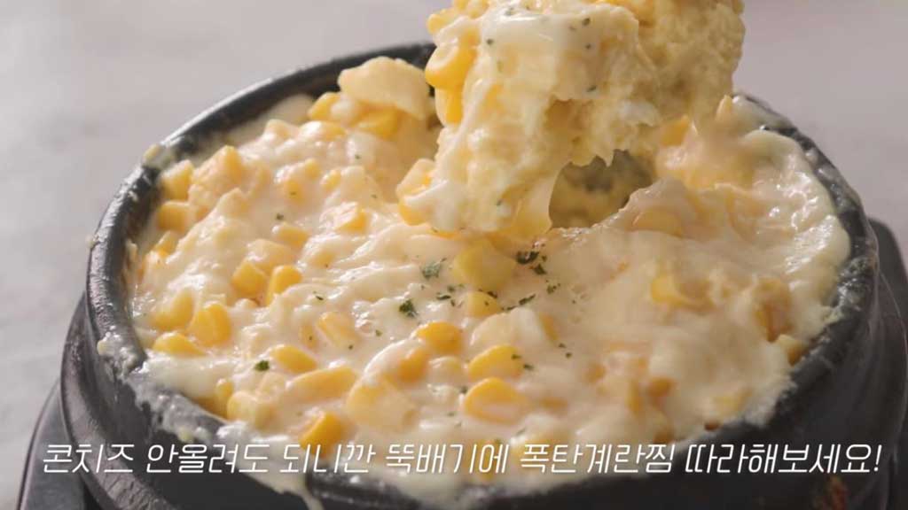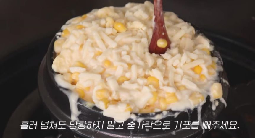 계란이 이렇게 몽글몽글하게 익으면 약불보다 더 약하게 줄이고 스위트콘, 모짜렐라치즈를 듬뿍 올려줍니다.