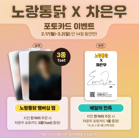 [ #노랑통닭 X #차은우 포토카드 증정 #이벤트] View this post on Instagram A post shared by 노랑통닭 공식 인스타그램 (@norangtongdak_official)
